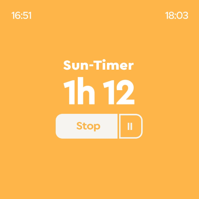 Die Zeitmessfunktion berücksichtigt deinen Hauttyp und den verwendeten LSF, um dir genau anzuzeigen, wie lange du sicher in der Sonne bleiben kannst. Nutze die Pausenfunktion, um den Timer bei Bedarf anzuhalten und wieder zu starten, wenn du dich erneut in die Sonne begibst. Sobald deine sichere Sonnenzeit abgelaufen ist, erhältst du eine Benachrichtigung, damit du rechtzeitig aus der Sonne gehst und Sonnenbrand vermeidest.